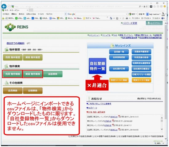 - このホームページは、「東日本・中部レインズIP型」の物件検索結果からダウンロードしたcsvファイルを、インポートして使用できます。