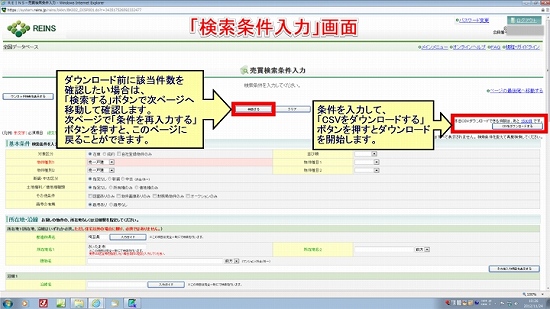 - 検索条件入力画面で条件を記入したら「csvをダウンロードする」ボタンを押します。